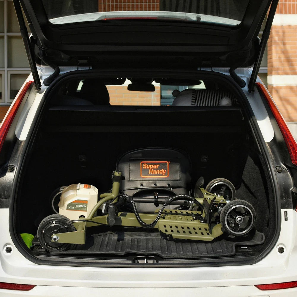 Dive into the specs that make the Super Handy Mobility Scooter a cut above the rest. From the ultra-portable one-step foldability to the smooth navigation provided by the sturdy 4-wheel structure and front-wheel suspension, every detail is designed with your freedom in mind. Zip through your day at speeds up to 3.7mph and enjoy extended mobility with our dual battery system. It's not just a scooter; it's your ticket to a more vibrant, independent life. FFA travel approved.