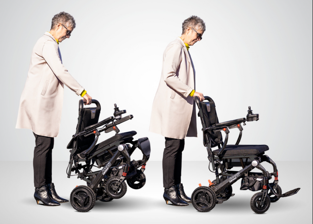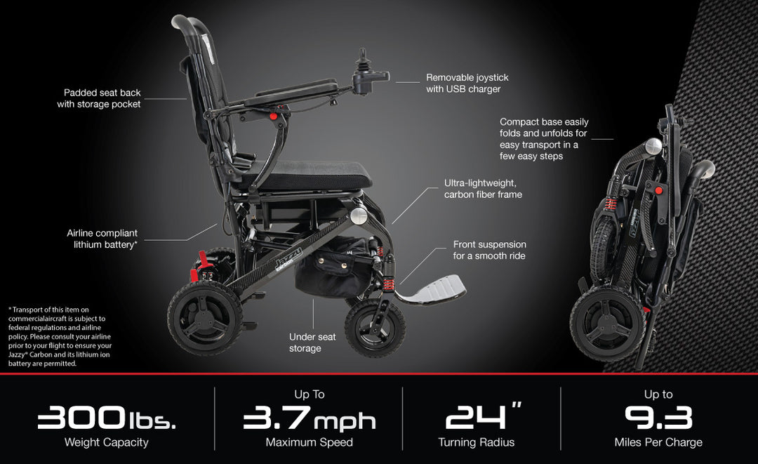 This ultra-lightweight, airline-compliant power chair is perfect for travel, supporting up to 300 lbs. It features a removable joystick with a built-in USB charger, front suspension for a smooth ride, and a compact carbon fiber frame that folds easily.